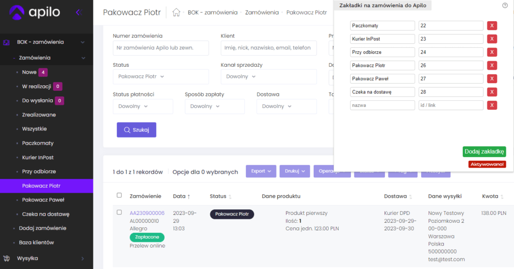 Za pomocą tej dedykowanej aplikacji do Apilo dodasz do menu „BOK – Zamówienia” nieograniczoną ilość zakładek na zamówienia. Do tej pory utworzone dla zamówień statusy były przypisane do jednej z dostępnych zakładek (Nowe, W realizacji, Do Wysłania) – czas to zmienić! Z tym rozszerzeniem utworzysz dedykowane zakładki, posegregujesz zamówienia i zaczniesz łatwiej poruszać się po programie.
