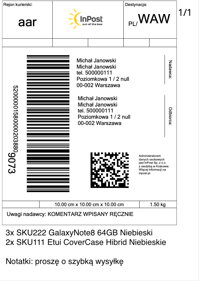Rozszerzone informacje na etykietach: Ilość produktów, SKU lub nazwa, kod kreskowy zamówienia oraz notatki dodawane są na marginesie etykiety, omijając standardowy limit 32 znaków.