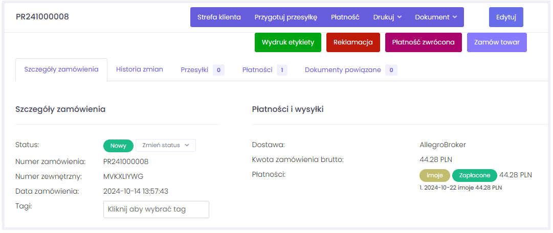 Akcje dostępne w widoku „Szczegóły zamówienia” oraz widoku „Wyślij przesyłkę” to: